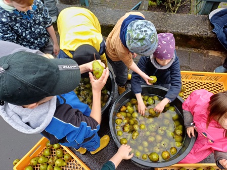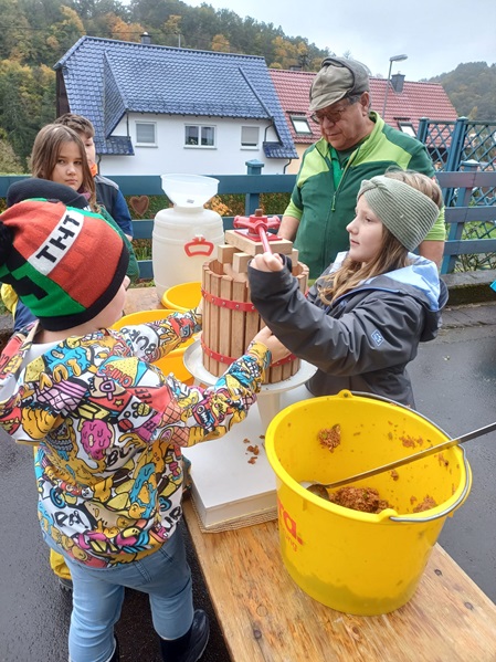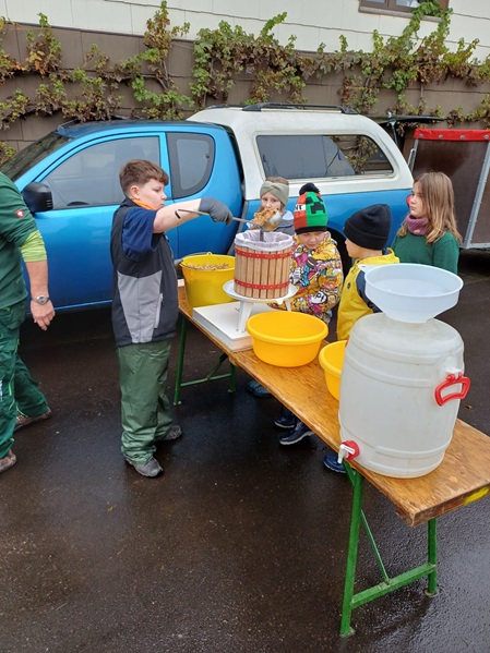 Ca. 500 kg Äpfel und Birnen wurden gesammelt. Weitere 200 kg brachten Eltern und Bekannte mit. Daraus konnten fast 400 l Apfelsaft gepresst werden. Alle Kinder erhielten als kleine Belohnung für ihre Mühen einen Bag in Bag-Beutel mit leckerem Apfelsaft.